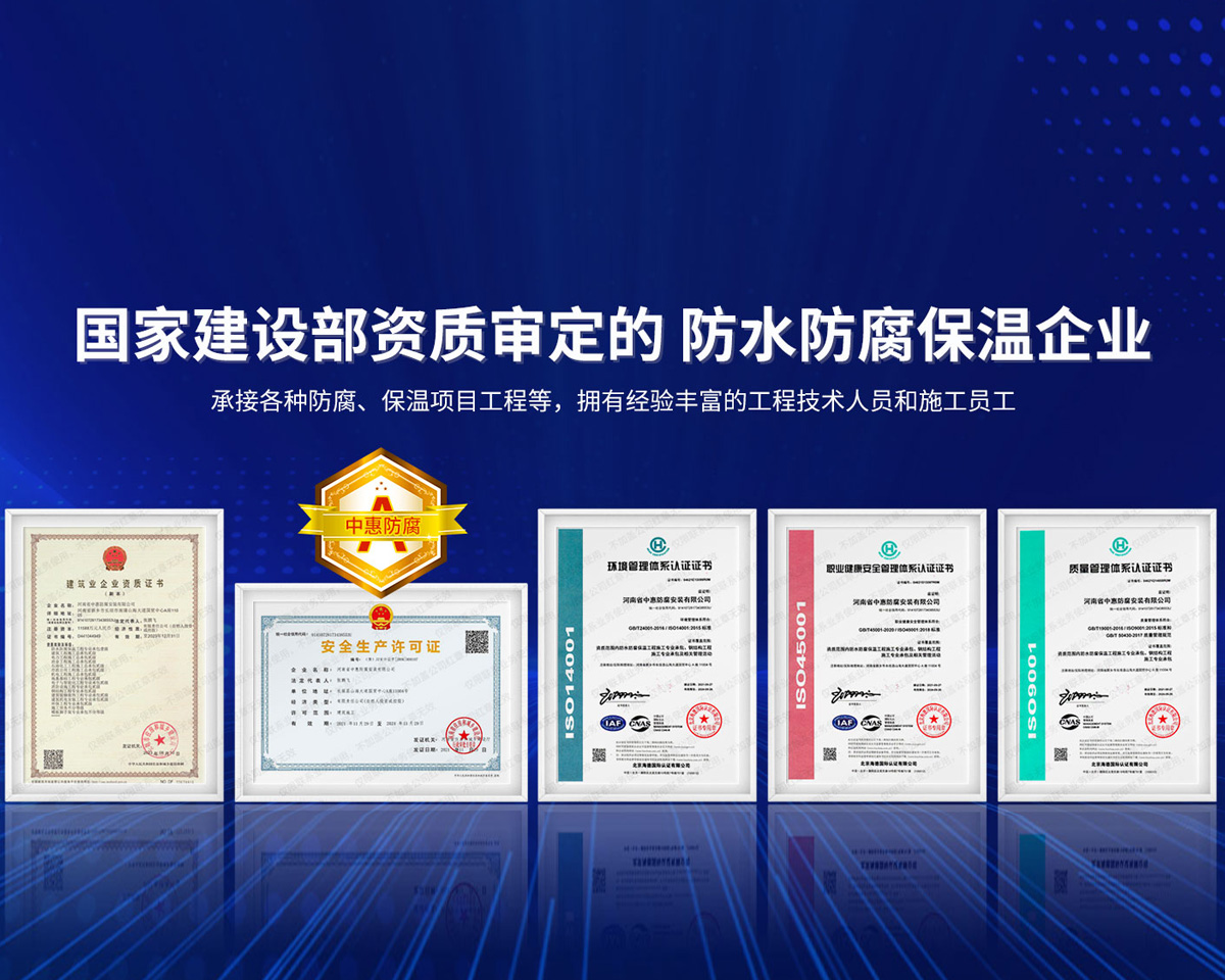 公司經營范圍:防水防腐保溫工程;消防設施工程;建筑裝修裝飾工程;建筑機電安裝工程;電力工程;建筑工程;石油化工工程;工業清洗工程;油罐清洗工程;鋼結構工程;環保工程;模板腳手架工程;電纜防火封堵、防污閃噴涂、外墻外保溫工程;各類施工勞務作業;設備維修、船舶鉚焊、涂裝;電力工程材料、建材、防水材料、防火材料、防腐保溫材料銷售,并相繼通過了GB/T19001-2008idtISO9001:2008GB/T50430-2007質量管理體系認證證書。GB/T24001-2004idtISO14001:2004環境管理體系認證證書。GB/T28001-2011idtOHSAS18001:2007職業健康安全管理體系認證證書。公司是中國防腐蝕于防護協會、中國施工企業管理協會、電力協會和中國鋼結構防水協會會員單位。 公司的經營業務涵蓋了石油、化工、電力、冶金、煤炭、船舶、國防、燃氣、水利、環保、交通運輸、航空及國防軍工和輕紡市政等行業的防腐保溫絕熱設備。鋼結構安裝、防火、防水、金屬噴鍍、聚脲噴繪、陰極保護、防滲透堵漏、玻璃鋼及各種磚版材料襯里、橡膠襯里、煙氣硫和耐酸溶劑腐蝕等工程施工。公司連續十年榮獲“省市先進施工企業”“安全生產先進單位”“重合同,守信用企業”和“AA***資質企業”的稱號。2000年被命名為市級文明單位,2002年被國家工商行政管理局命名為“重合同,守信用的企業”、被中國工業防腐蝕技術協會命名為“防腐蝕企業,能源節約及環境保護領域有豐富的經驗和***的業績。工程一次交驗合格率100%。其中攀枝花鋼鐵公司煉鐵廠四號高爐及熱風爐防腐工程、上海寶鋼公司煤氣柜防腐工程、撫順石油一廠裝置防腐項目、齊魯石化公司稀烴廠高塔防腐工程、吉林化學工業公司煉油廠油罐防腐工程、天津石化熱電廠六號爐頂棚聯絡管保溫工程、大慶油田(太倉)力神泵業工程、中國化學工程第十一建設工程、中原油田勘探局工程、中國石化銷售有限公司華北分部、魯皖輸油管道工程、貴州開磷息烽合成氨工程、陜西黃陵煤化工程、中國石油天然氣西部管道塔里木輸油工程、邯鋼集團邯寶鋼鐵公司煉鐵工程、德州供電工程、吉寶(南通)船廠工程,偃師華潤熱力工程、鄭州熱力總公司。 河南省中惠防腐安裝有限公司愿以豐富的施工經驗,***的技術,***的設備,***的管理,***的服務,竭誠為國內外廣大的用戶提供***滿意、******的工程作品。 我公司愿與國內外同仁一道,團結協作,共同推進防腐蝕行業發展! 公司地址:河南省長垣縣建設路北段360號 固定電話:0373-8866488 郵編:453400 網址:http://www_zhff_com_cn.changxinjiqi.com